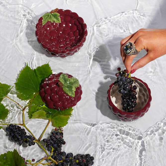 Conçu en céramique émaillée dans un joli bordeaux profond, il se distingue par son design texturé en relief rappelant les grains d’un raisin et sa feuille verte en guise de couvercle.