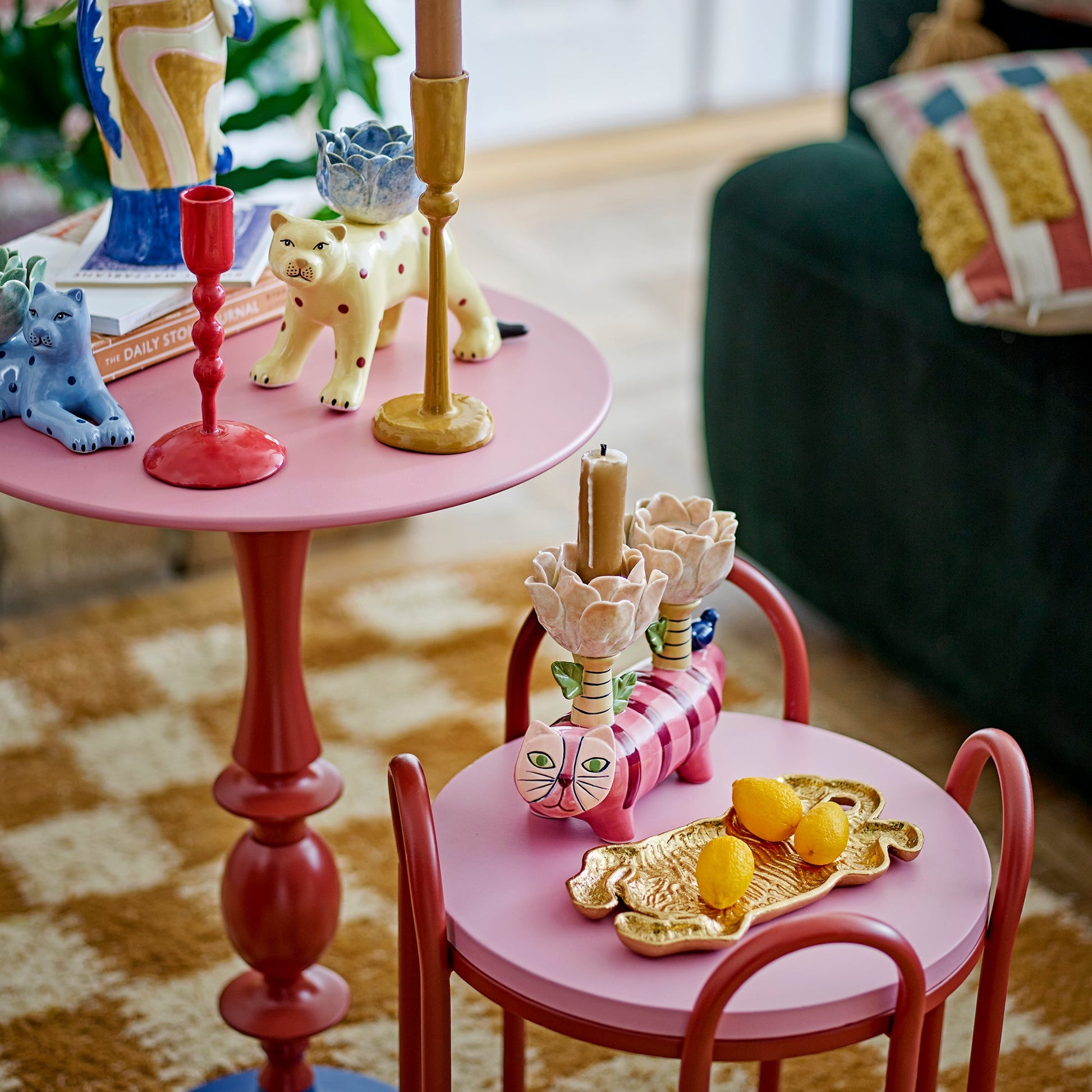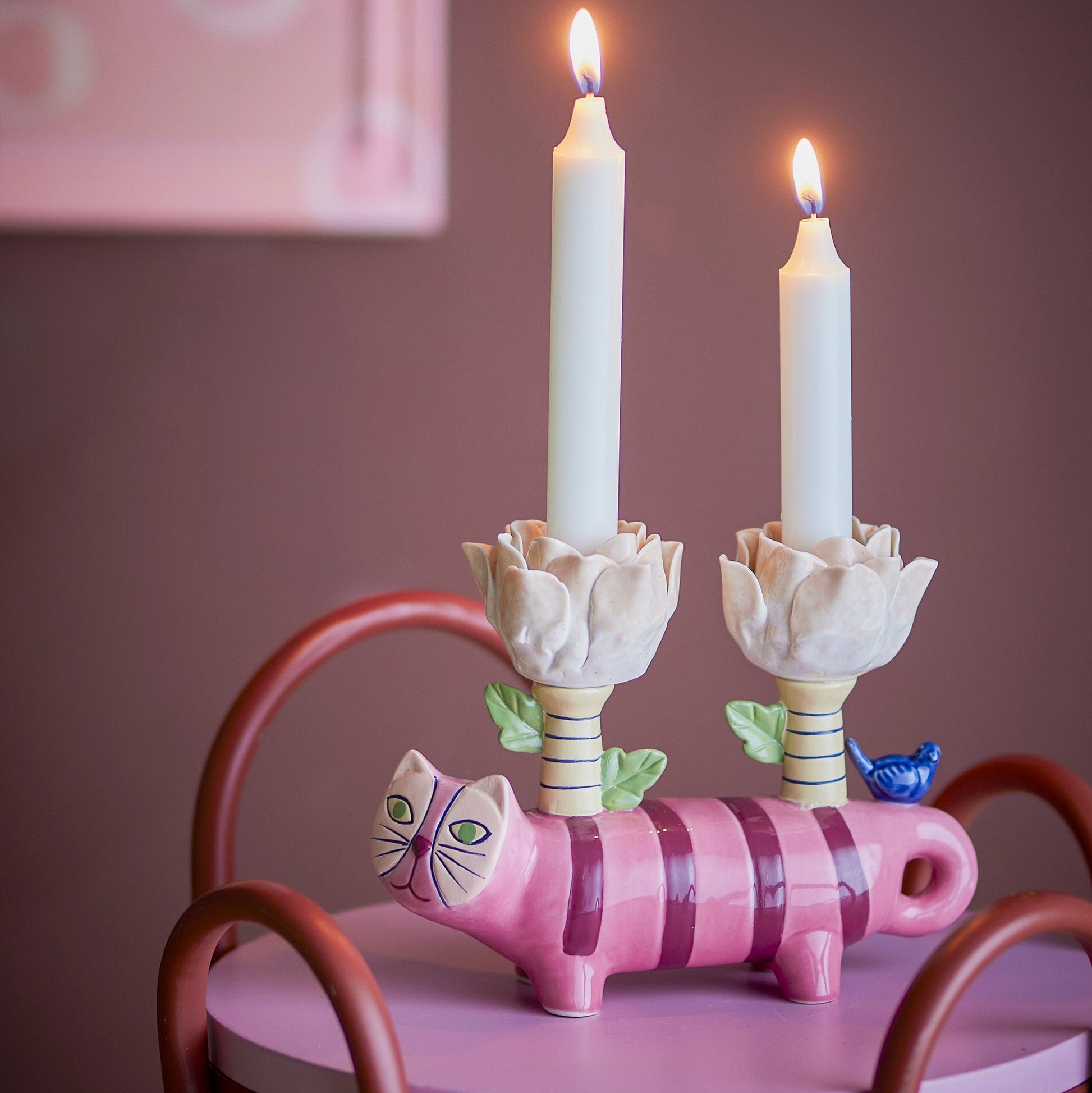 Le bougeoir Missy de Bloomingville est une pièce décorative pleine de poésie et de fantaisie. Réalisé en grès et peint à la main, il représente un adorable chat rose surmonté de deux bougeoirs en forme de fleurs, aux délicates nuances de jaune, vert et bleu.