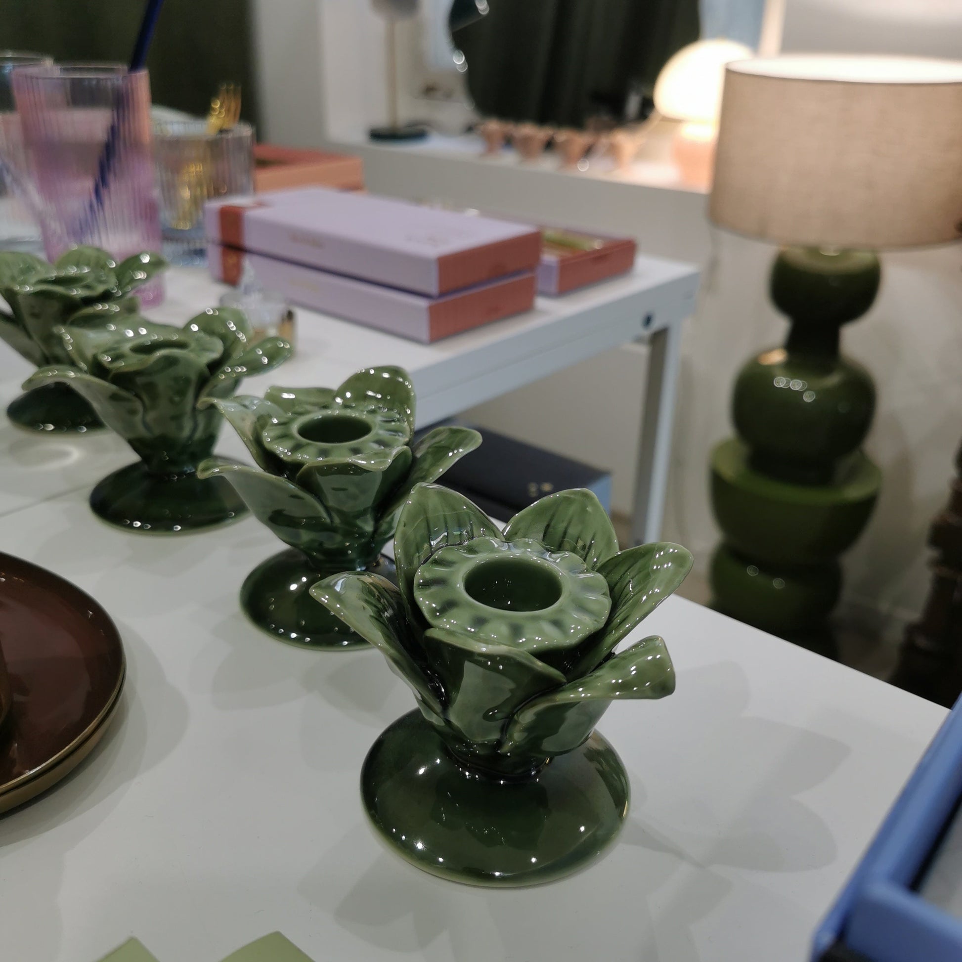 Ce bougeoir en céramique, en forme de fleur tropicale épanouie, invite la poésie et la fantaisie à votre table. Avec ses lignes délicatement sculptées et sa teinte vert palmier brillante, il attire la lumière autant qu’il la diffuse. Une pièce déco à la fois audacieuse et raffinée, idéale pour créer une ambiance chaleureuse en solo ou en accumulation.