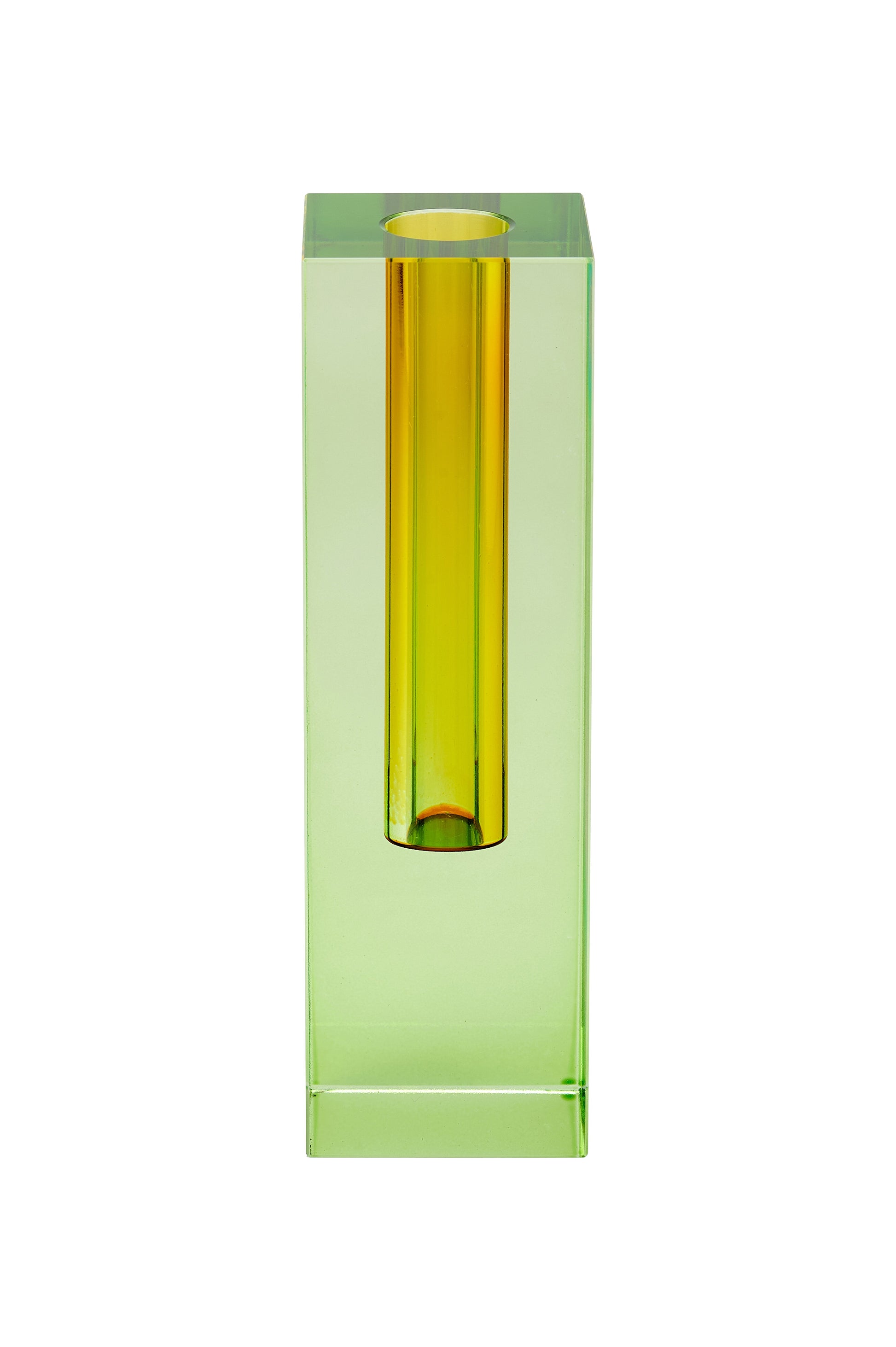 Jeu de transparence et de contraste pour cet objet design, à la fois bougeoir et soliflore. Ce modèle bicolore associe un extérieur vert anis lumineux à un insert intérieur jaune doré, pour un effet chic et original.