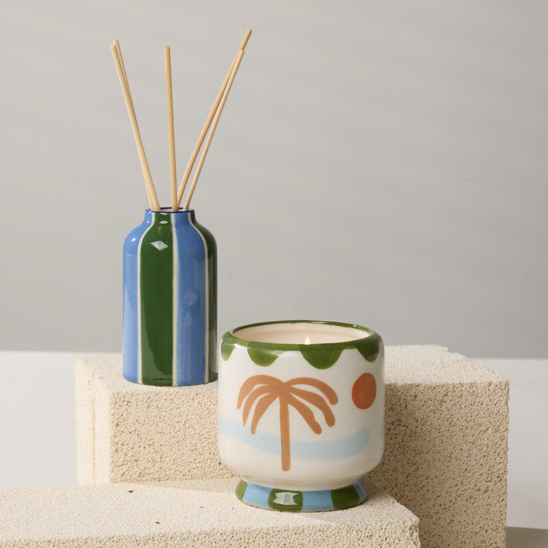 A Dopo ! signifie « à plus tard ! ». Chaque bougie est conçue pour apporter l'énergie et l'excitation d'un été à l'étranger. Inspirée par les couleurs vibrantes et les motifs accueillants de la Méditerranée, chaque récipient en céramique de 226 g est minutieusement peint à la main, chaque coup de pinceau ajoutant une touche artisanale.