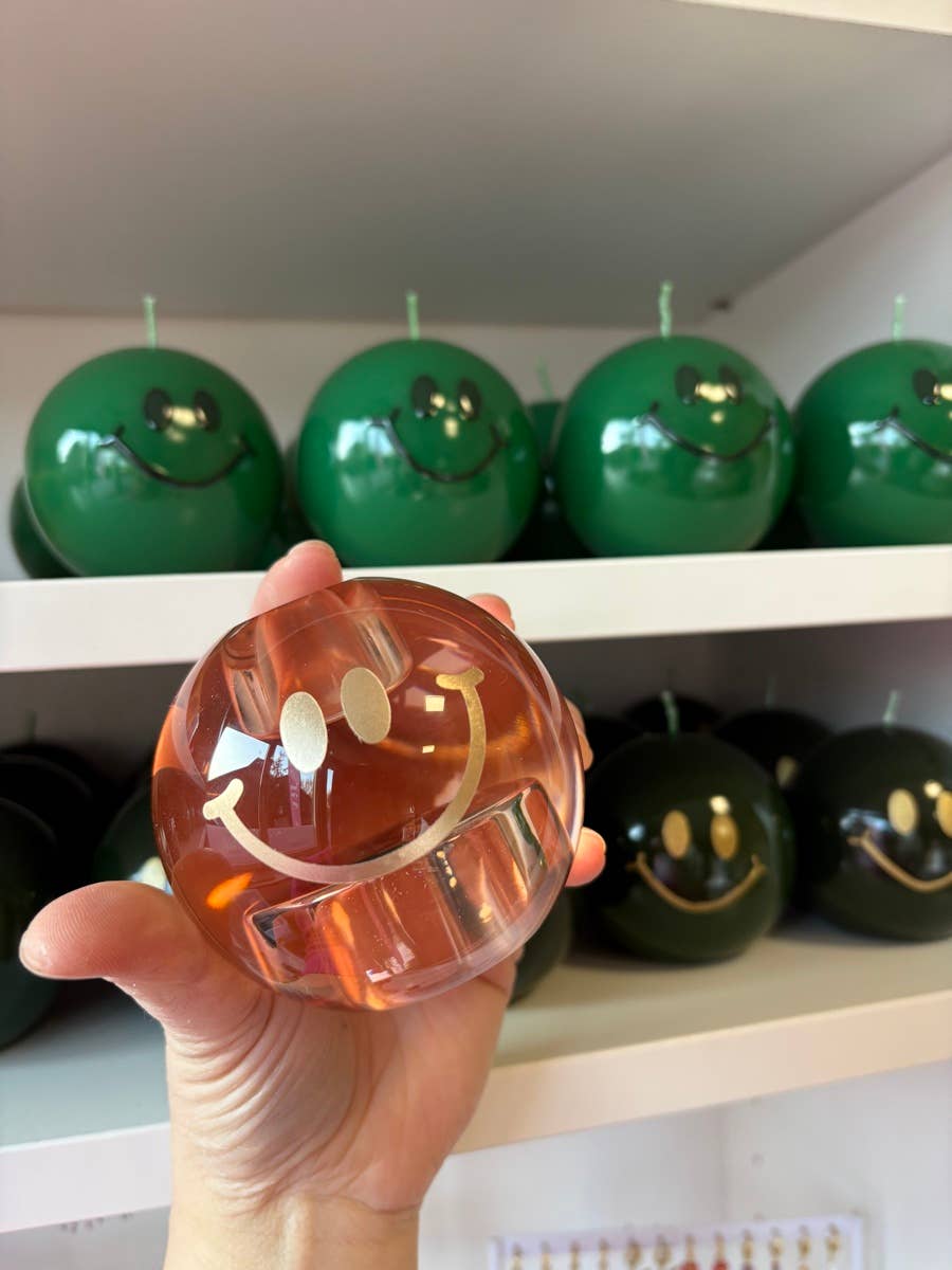 La bougie sphérique smiley AIF Candles est une création joyeuse et artisanale qui met instantanément de bonne humeur. Sa forme ronde, sa finition brillante et son visage souriant en relief 3D en font un véritable petit objet déco, aussi expressif qu’attachant.