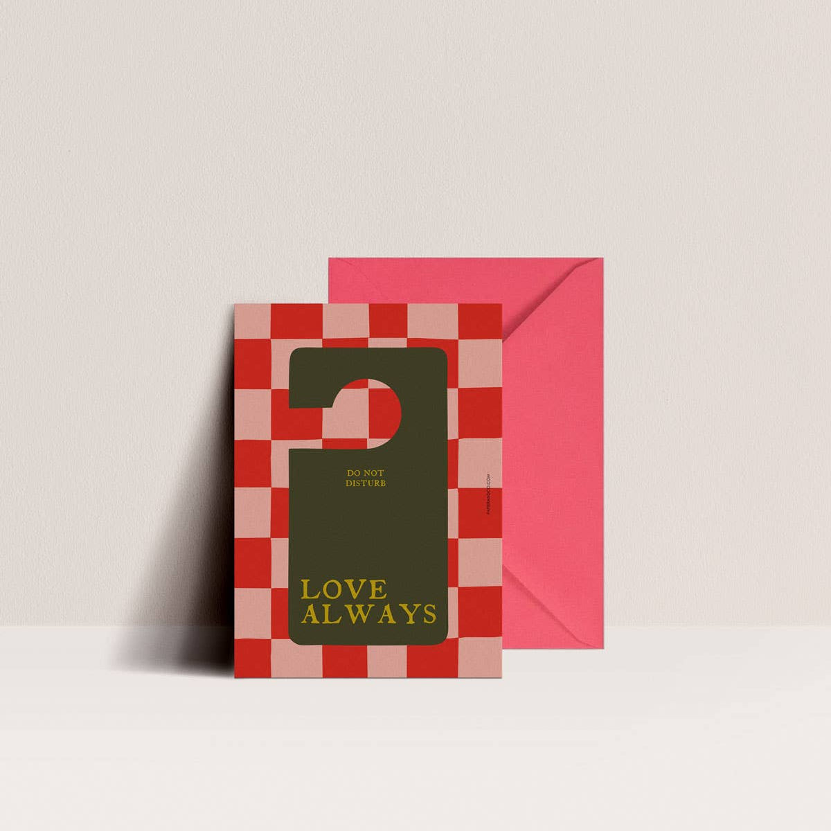 Graphique, audacieuse et pleine d’humour, la carte “Love Always” de Papier & Co détourne l’iconique accroche Do Not Disturb pour en faire une déclaration d’amour moderne et assumée. Son motif à carreaux rouges et roses, associé à un vert profond et une typographie élégante, en fait une carte à la fois pop et design.