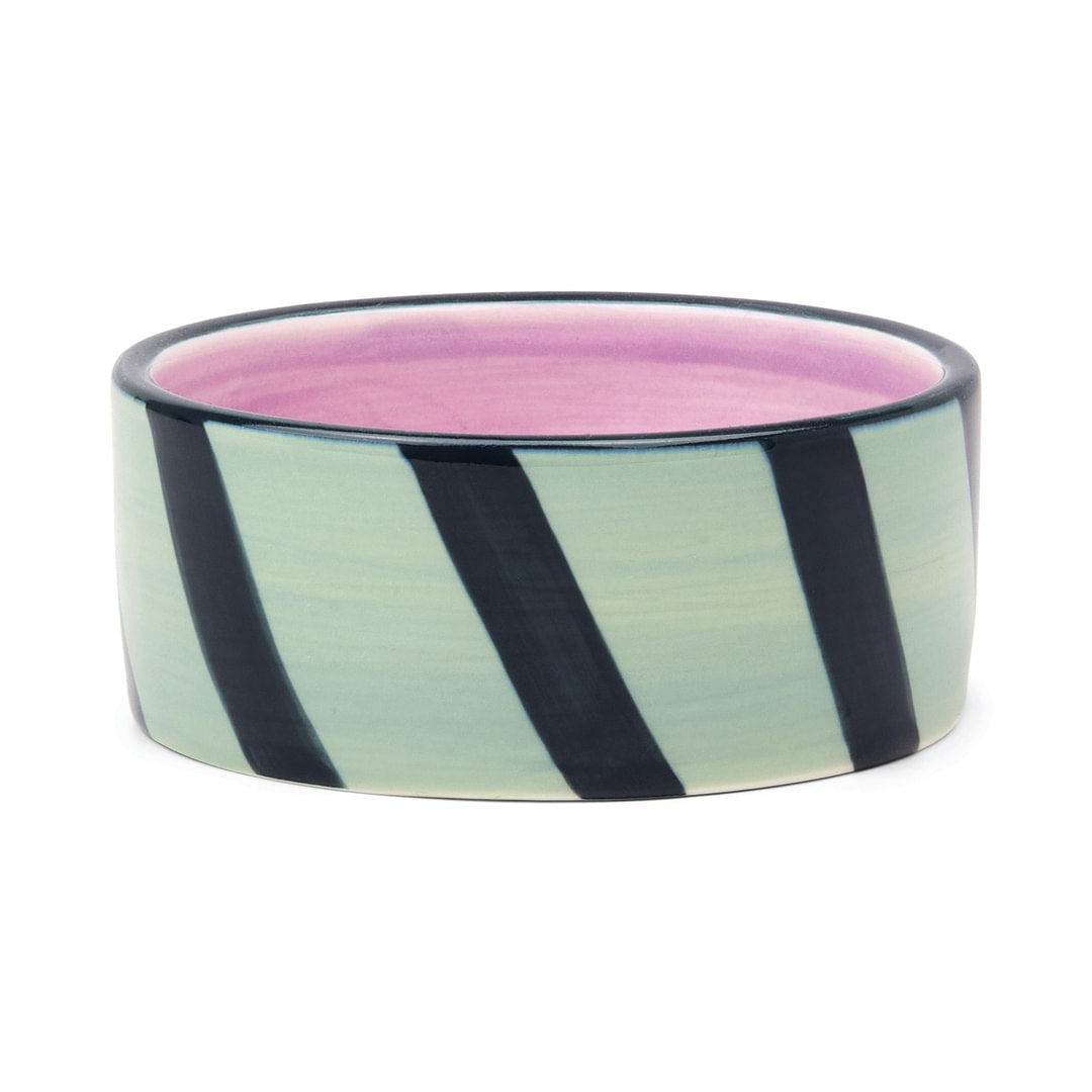 Entièrement peint à la main, ce dessous de bouteille en céramique combine des couleurs vibrantes – vert menthe doux, intérieur violet et larges rayures bleues – pour un design moderne et audacieux.