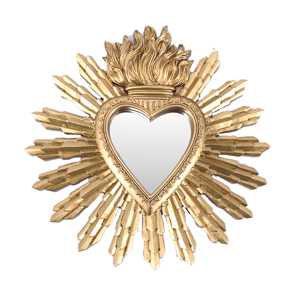 Disponible en deux coloris — doré classique ou burgundy profond — il attire le regard et capte la lumière. Avec sa forme de cœur stylisé, sa flamme sculptée et son miroir central, il évoque à la fois la ferveur et l’élégance.