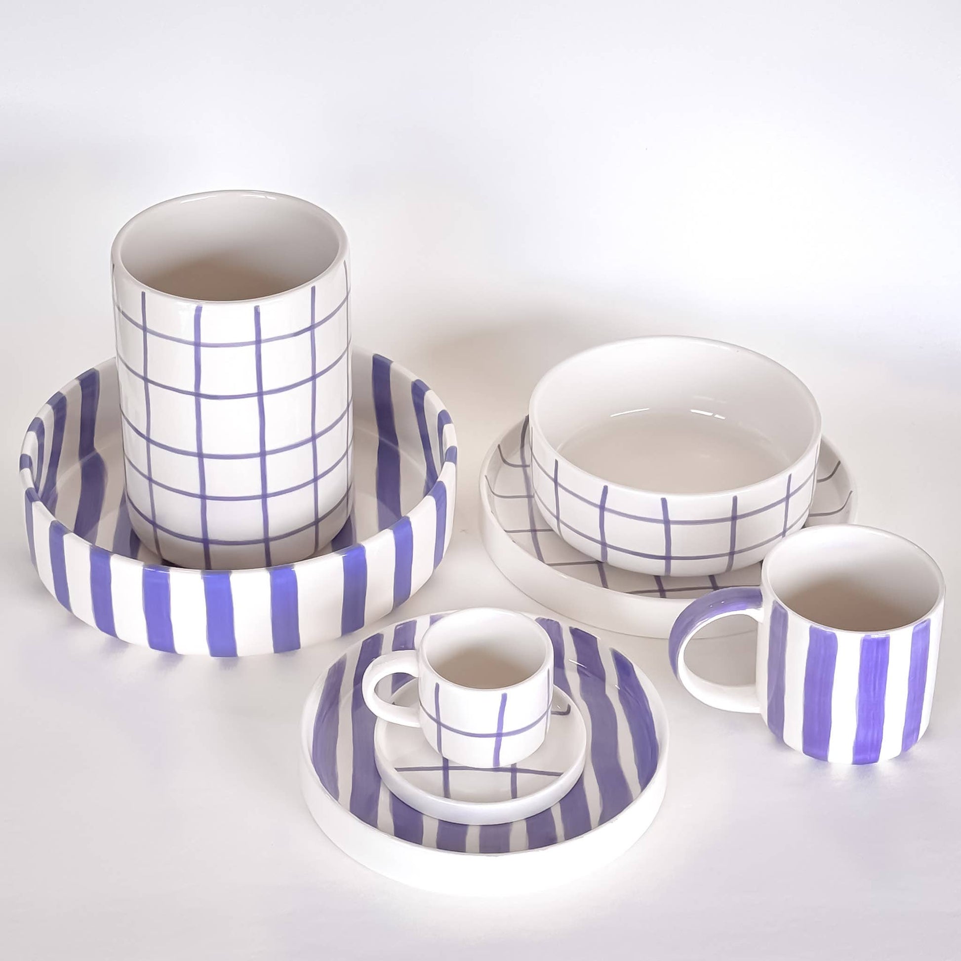 Chaque tasse est peinte à la main, ligne après ligne, ce qui lui confère une personnalité unique. Le quadrillage violet, appliqué manuellement, crée un motif vivant et authentique, typique du savoir-faire de Magazin Minori.