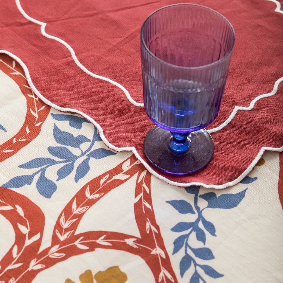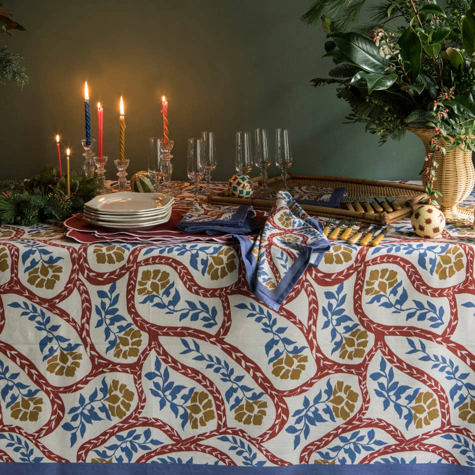 Cette grande nappe en coton signée Mahe Homeware habille la table d’une touche chaleureuse et colorée. Son motif végétal façon cachemire mêle des teintes ocre, bleu pervenche et terracotta sur fond écru, bordé d’un pourtour violet doux. Une composition joyeuse et élégante, idéale pour égayer un repas du quotidien comme une table de fête.