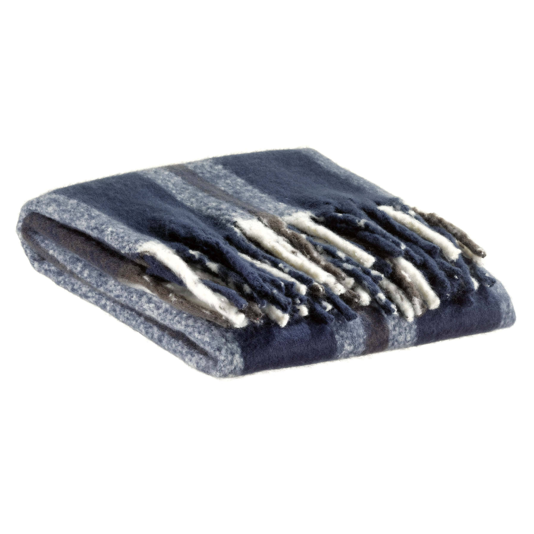 Tissé en 100 % polyester recyclé, il affiche un aspect mohair aérien et soyeux qui réchauffe instantanément canapé, fauteuil ou bout de lit. La finition à grandes franges torsadées lui apporte une touche mode. Coloris marine/bleu profond animé de nuances (effet rayé subtil) pour un rendu chaleureux et élégant.
