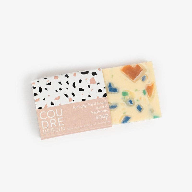 Fabriqué à la main à Berlin, le savon artisanal Limestone séduit par sa base claire ponctuée d’éclats colorés façon terrazzo. Un design lumineux et élégant qui apporte une touche décorative naturelle à la salle de bain.