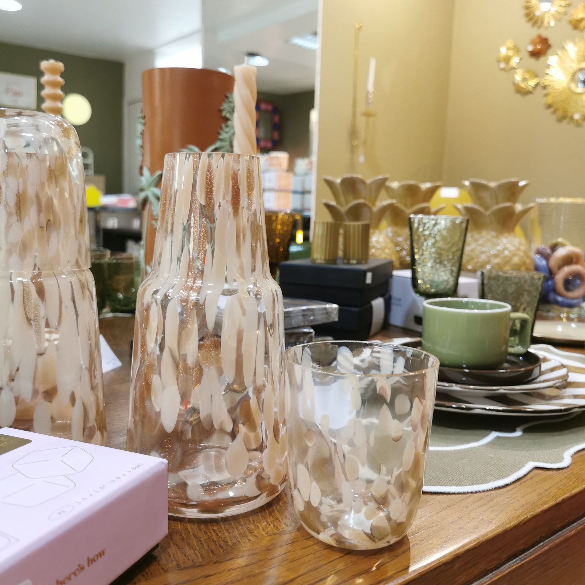 Ce joli duo carafe + verre signé OPJET PARIS allie praticité et élégance. En verre soufflé moucheté de doré et de blanc, avec quelques paillettes, il sublimera votre table de chevet, votre salle de bain ou une table d’appoint. Le verre s’emboîte parfaitement sur la carafe pour une solution gain de place aussi déco qu’utile.