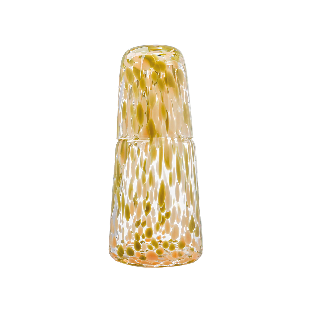 Ce joli duo carafe + verre signé OPJET PARIS allie praticité et élégance. En verre soufflé moucheté de kaki et de beige, il sublimera votre table de chevet, votre salle de bain ou une table d’appoint. Le verre s’emboîte parfaitement sur la carafe pour une solution gain de place aussi déco qu’utile.