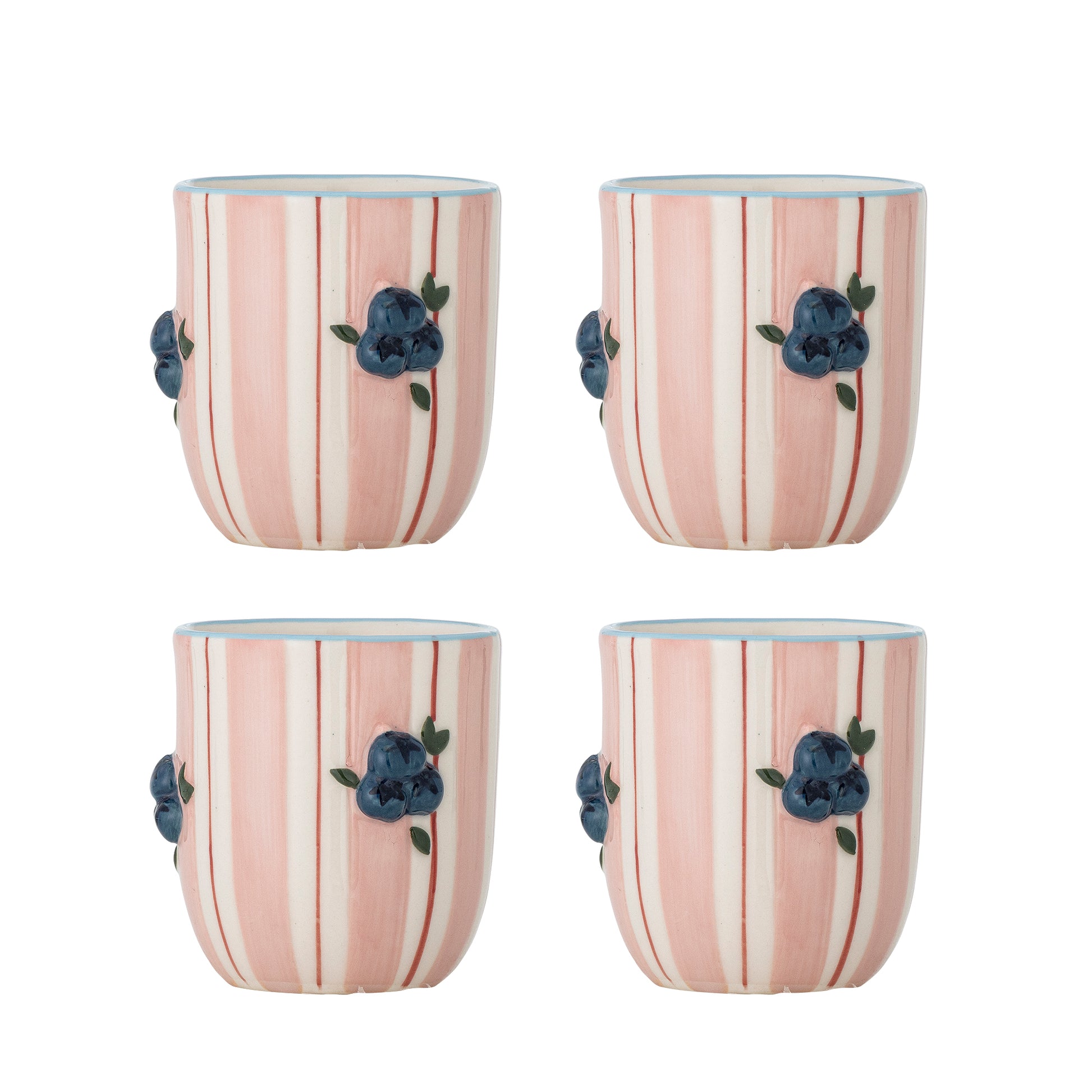 La Tasse Carry de Bloomingville séduit par son charme délicatement rétro et son esprit artisanal. Ce set de deux tasses en grès présente une palette rose poudré soulignée de rayures verticales crème et de motifs floraux en relief, peints à la main.