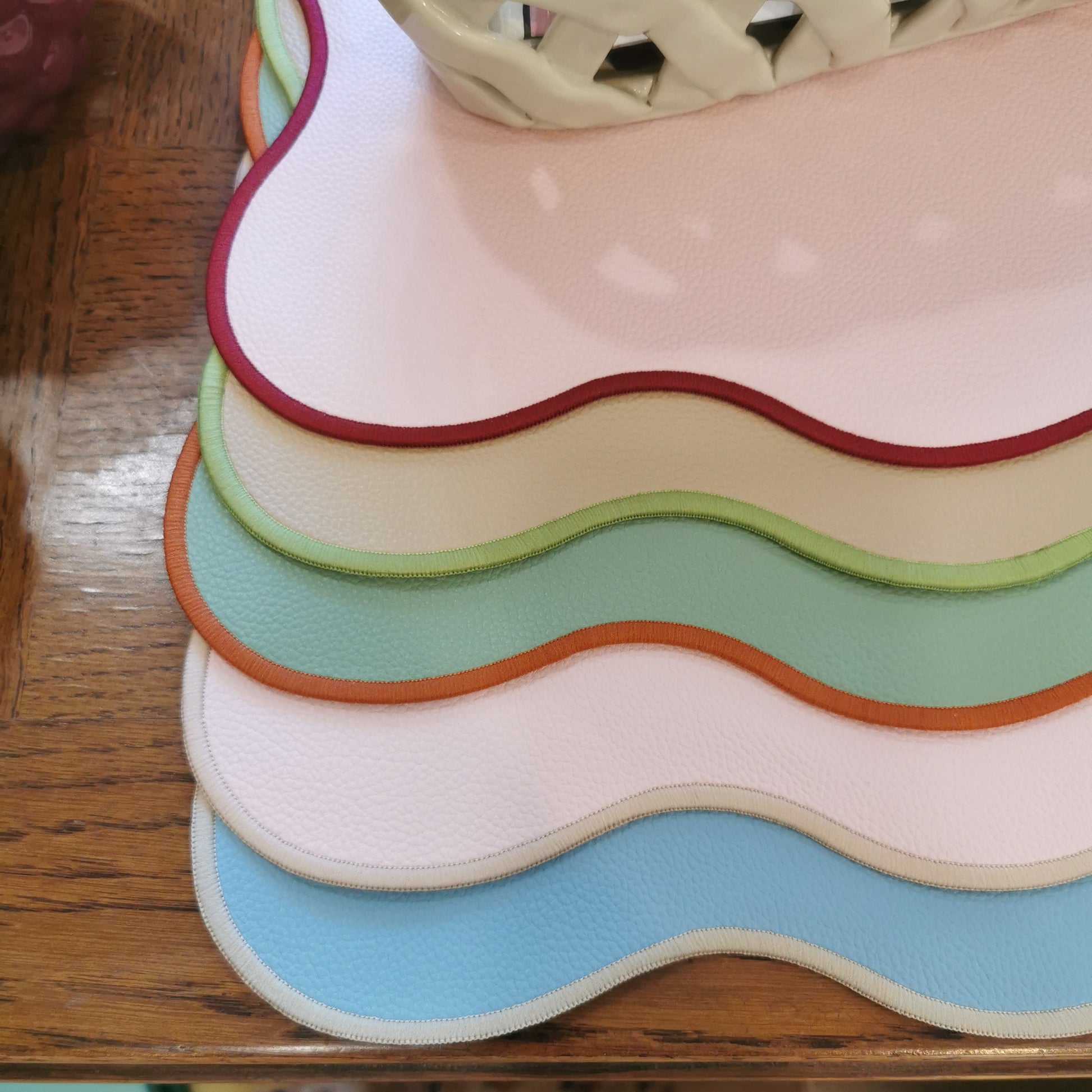 Le set de table JULIETTE apporte une touche chic et graphique à vos tables du quotidien. Sa forme ondulée et sa piqûre contrastée donnent l’illusion d’une finition couture, tandis que la matière façon cuir se nettoie d’un simple coup d’éponge. Léger, souple et anti-tache, il protège la table sans sacrifier le style.