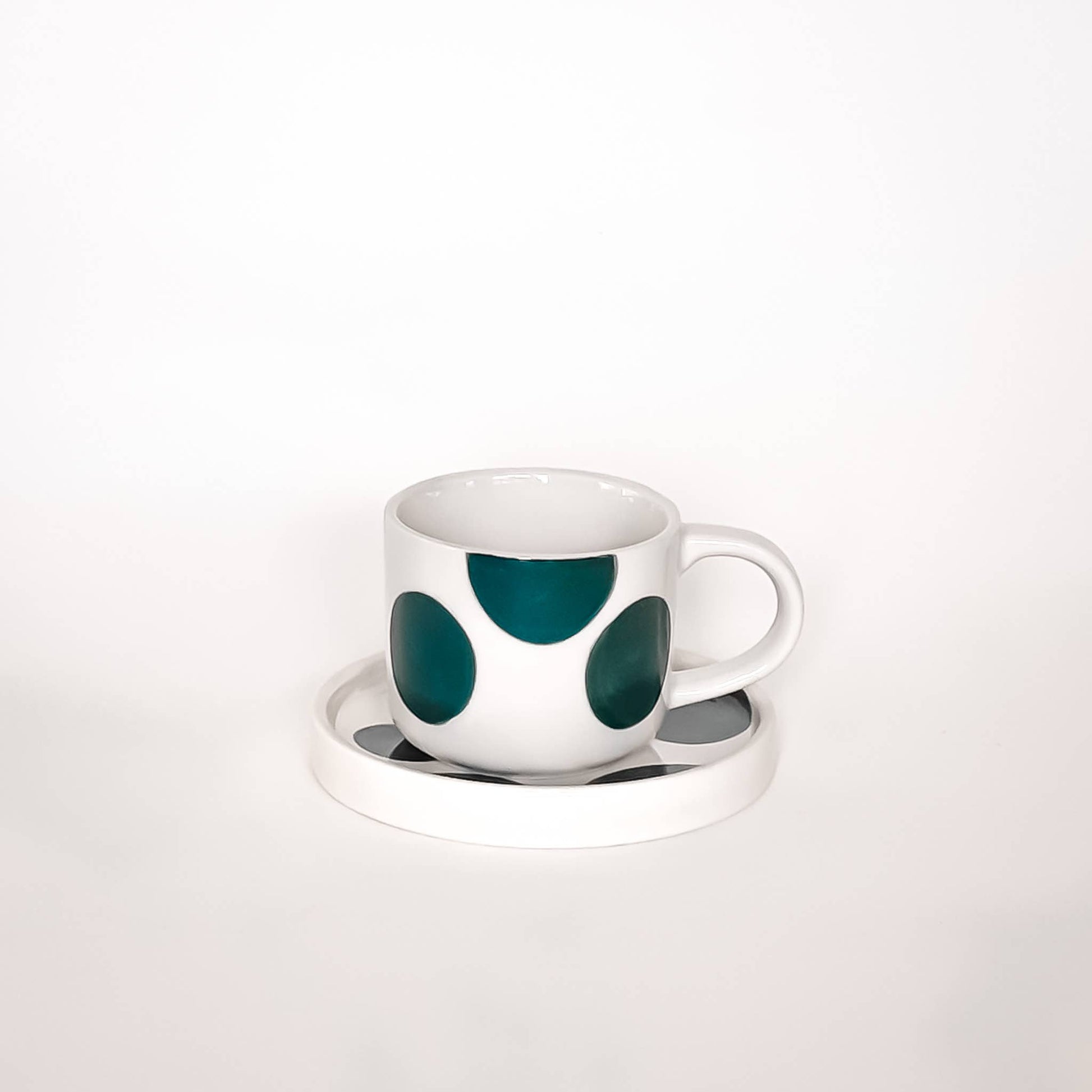 Les pois peints à la main sur céramique émaillée apportent un esprit graphique et délicat, parfait pour illuminer les pauses café.