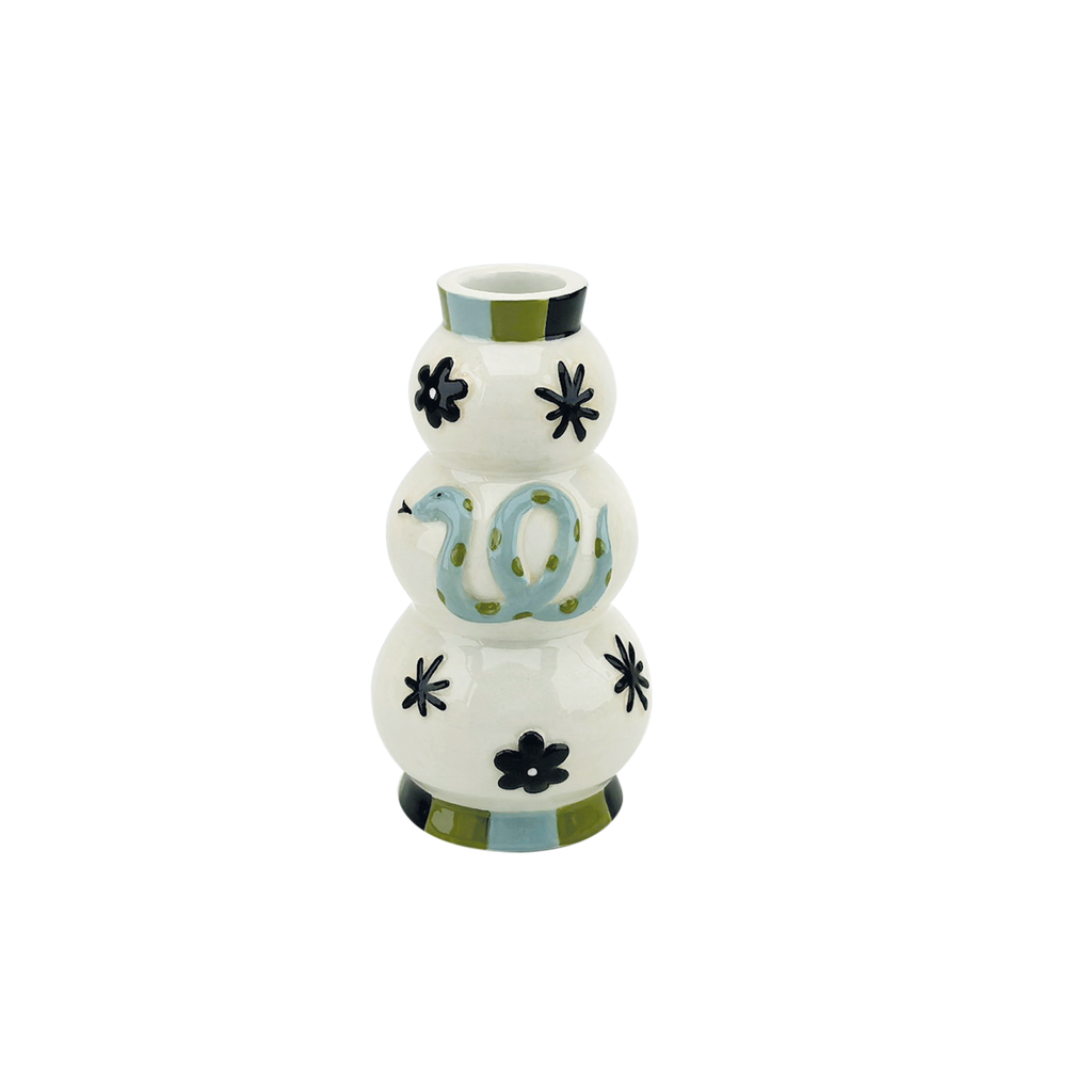 Original et plein de caractère, ce soliflore “Serpent” signé OPJET Paris revisite l’objet décoratif dans un esprit à la fois ludique et graphique. Sa silhouette sculptée en volumes superposés est délicatement ornée d’un serpent stylisé peint à la main, entouré de petits motifs floraux et de détails contrastés.