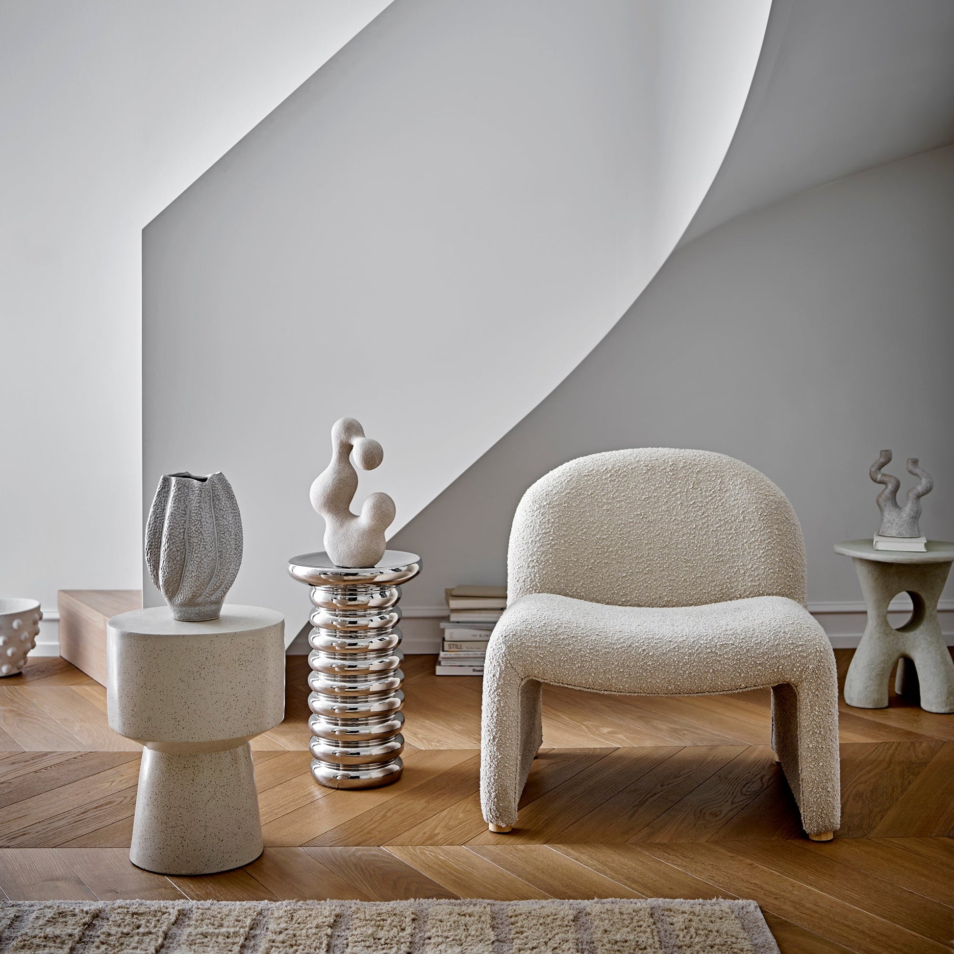 La table d’appoint Spike de Bloomingville séduit par son design sculptural et sa finition chromée ultra brillante. Réalisée en grès, elle affiche une silhouette cylindrique rythmée par des cannelures qui captent et reflètent la lumière avec élégance.