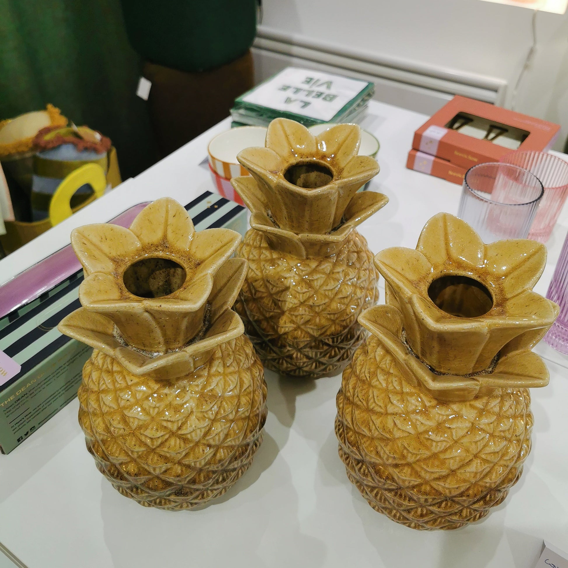 Avec sa forme d’ananas stylisée et son émail ocre aux reflets chaleureux, ce vase en céramique apporte une touche joyeuse et originale à votre intérieur. Il fonctionne aussi bien en vase pour petites fleurs séchées ou fraîches qu’en objet déco à poser seul sur une étagère ou une table d’appoint.