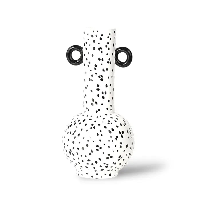 Le vase Asswan Dalmatien joue la carte du graphisme jusqu'au bout. Des taches irrégulières façon dalmatien, deux petites anses noires circulaires telles des oreilles, et voilà une pièce artistique à souhait pour votre intérieur.
