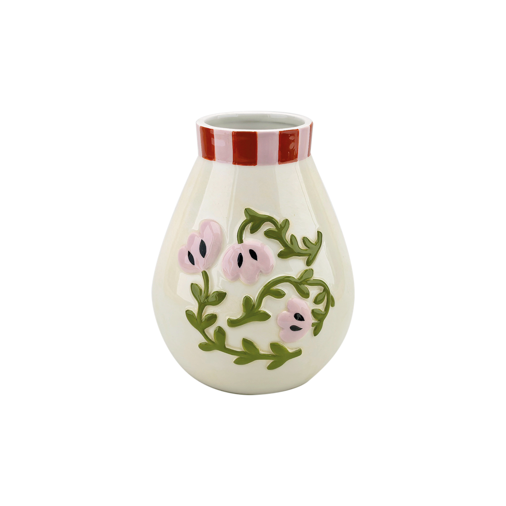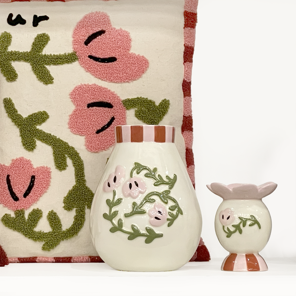 Délicat et plein de fraîcheur, ce vase en faïence fleurs roses signé OPJET Paris séduit par son esprit floral et son charme artisanal. Orné de motifs de fleurs peintes à la main et de feuillages verts délicatement dessinés, il apporte une touche romantique et joyeuse à votre décoration.