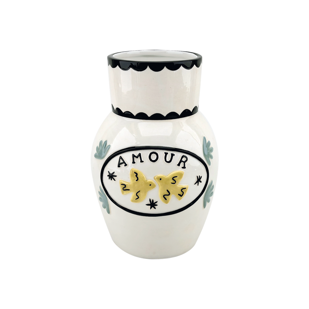 Poétique et délicatement décoratif, ce vase en faïence “Amour Oiseaux” signé OPJET Paris est une véritable déclaration d’amour à la décoration artisanale. Orné de deux oiseaux jaunes et de l’inscription Amour, il mêle symboles, douceur et élégance dans un esprit bohème chic plein de charme.