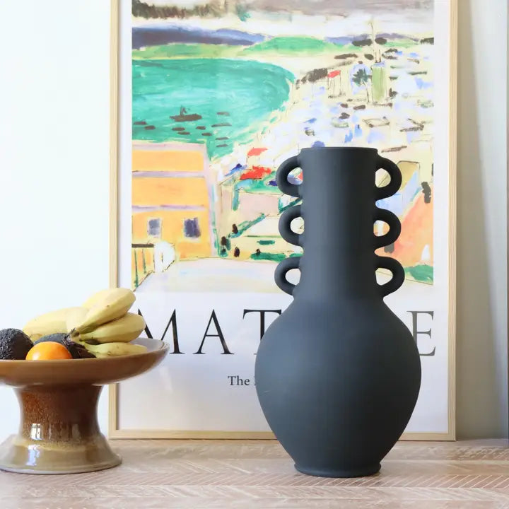 Le vase RINGS en céramique offre une touche d'originalité captivante à son environnement, en représentant une tête avec des oreilles en formes d'anneaux.