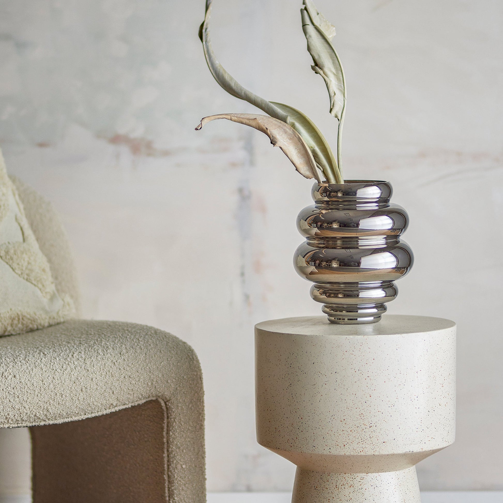 Réalisé en verre chromé argenté, il capte la lumière et reflète son environnement avec subtilité, créant un jeu de reflets sophistiqué. Utilisé seul comme objet décoratif ou accompagné de fleurs séchées ou fraîches, le vase Zorya attire immédiatement le regard et trouve facilement sa place sur une table, une console ou une étagère.