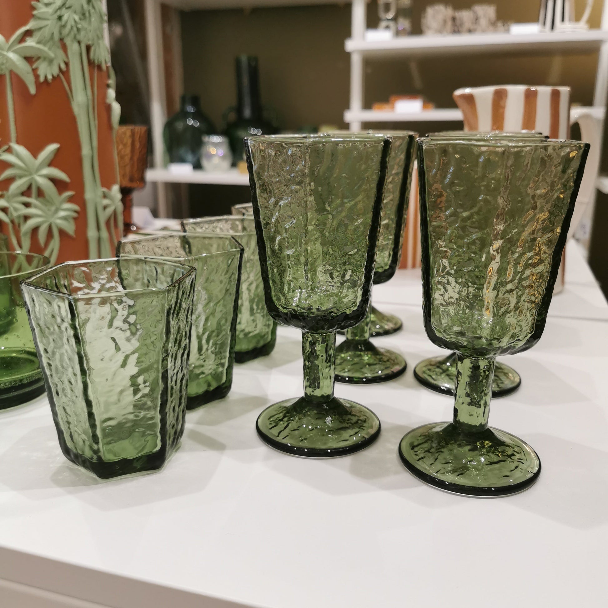 Déclinés en deux formats — verre à eau et verre à vin avec pied — et en quatre coloris (translucide, marron, vert bouteille, gris), ils vous permettent de composer un art de la table élégant et moderne. Parfaits pour les tables du quotidien comme pour les dîners.